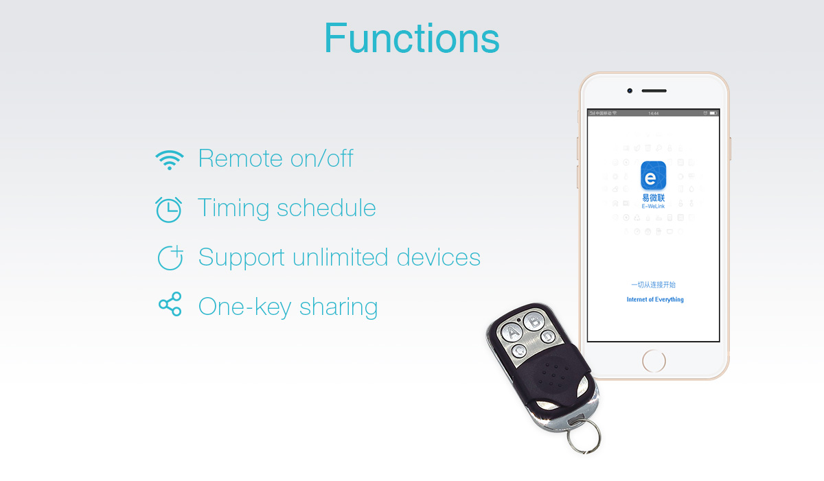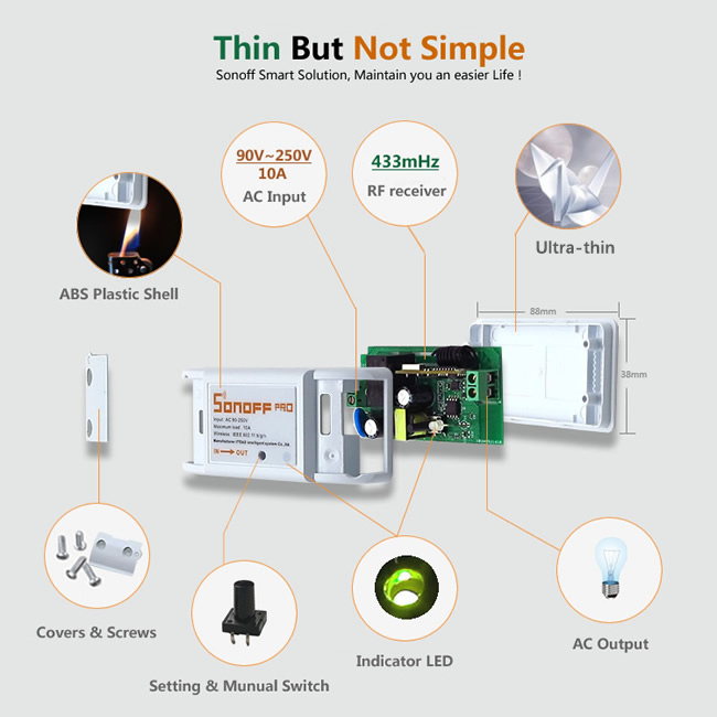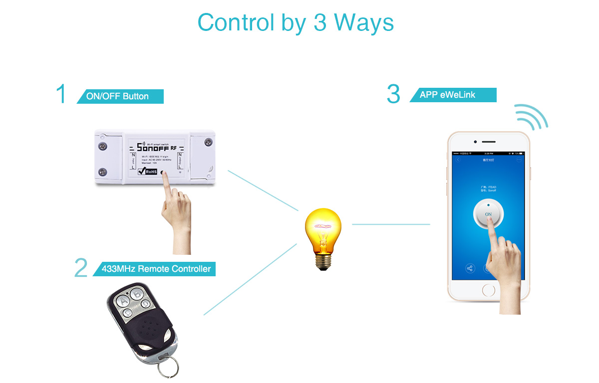 สวิตซ์เปิด-ปิดอุปกรณ์ไฟฟ้าผ่าน WiFi สำหรับ Smart Home สามารถใช้ควบคุมเครื่องใช้ไฟฟ้าได้หลากหลายชนิด SONOFF ส่งข้อมูลไปที่ระบบคลาวด์ (Cloud Server) ผ่านทางเร้าเตอร์ภายในบ้าน เพื่อทำให้สามารถควบคุมเปิดปิดเครื่องใช้ไฟฟ้าได้จากทุกที่ (รวมทั้งอยู่นอกบ้าน) เพียงแค่เข้าแอพ eWeLink ในสมาร์ทโฟน